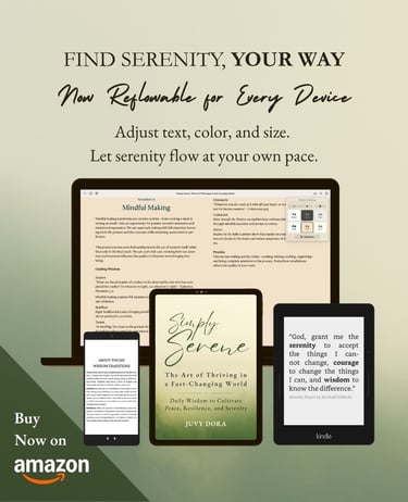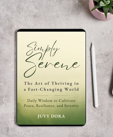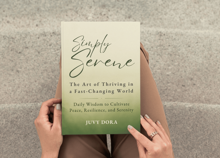 Simply Serene is a 366-day reflection book blending six inclusive wisdom traditions — Stoicism, Buddhism, Taoism, Christianity, Catholicism, and Science — into simple, beautiful practices that help you breathe deeper, live intentionally, and reconnect with your inner calm.